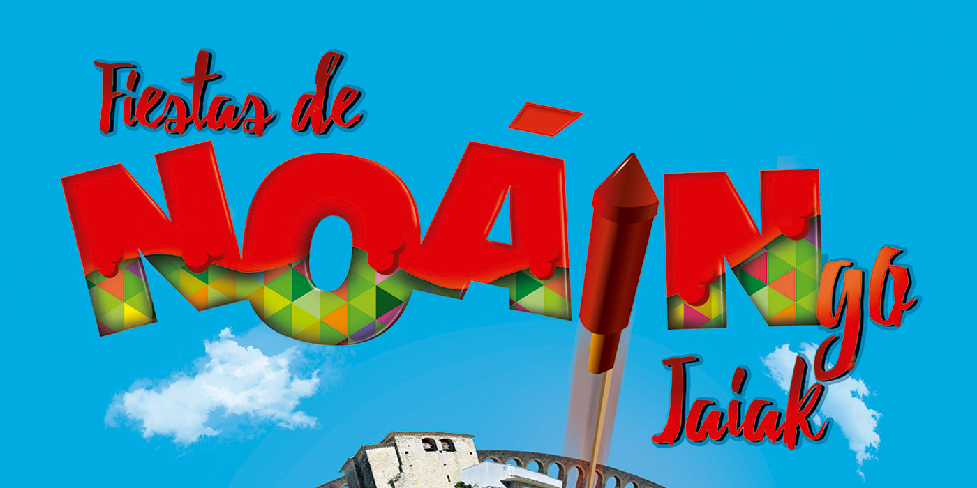 A nivel tipográfico quise darle un aire festivo y dinámico, utilizando una fuente irregular para el texto y otra de mucho peso para el nombre del pueblo, con las letras bailando y tiñéndose de rojo, color del pañuelo de fiestas, además de utilizar el cohete anunciador de las fiestas como letra «i».